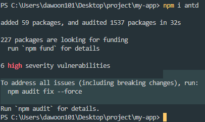 그리고 ant design에서 제공하는 css를 적용하기 위해서는 css import를 해야한다.